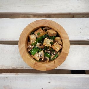 קוצצים שום, פטריות, אפונת שלג ג'ינג'ר וטופו.